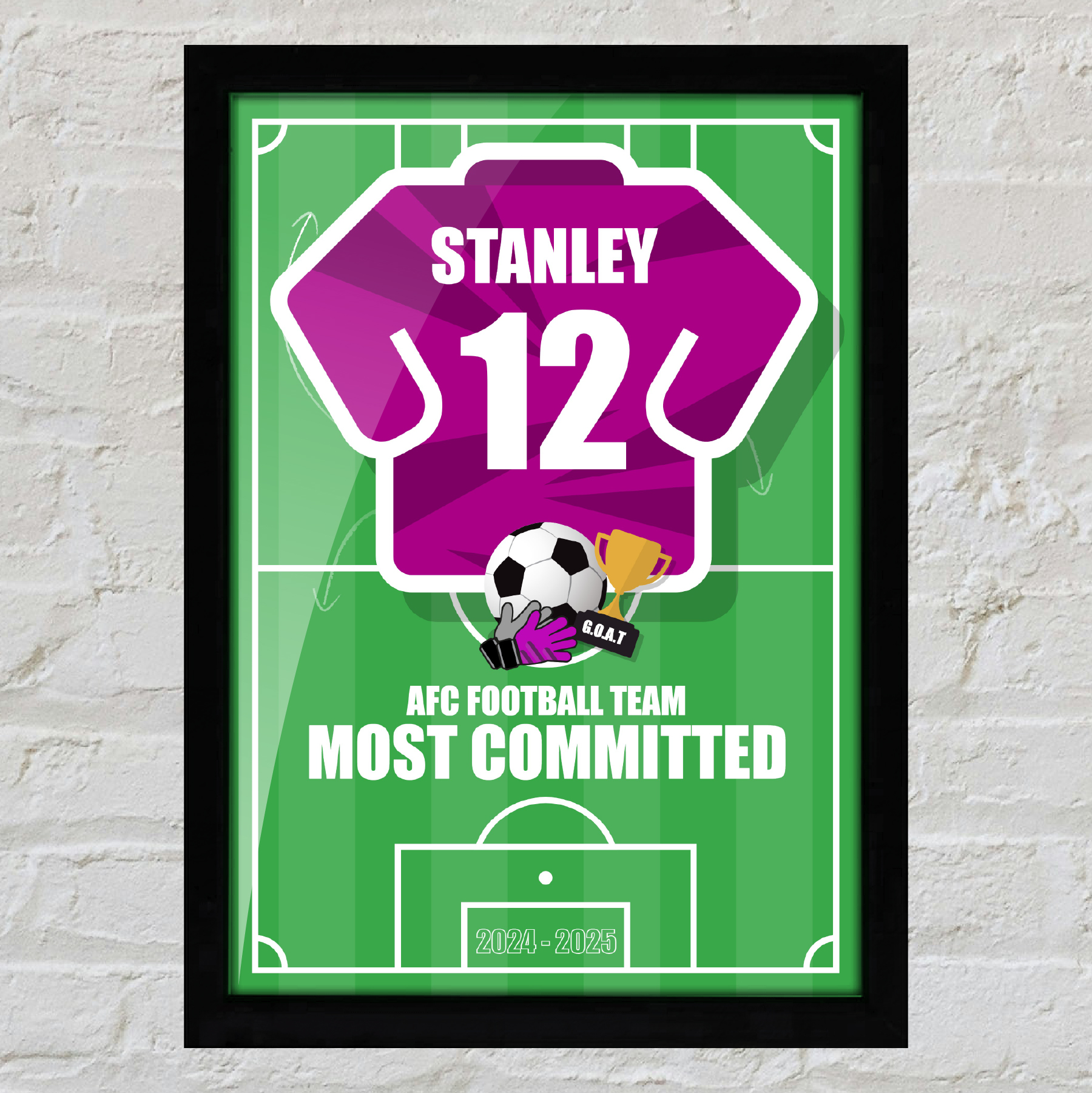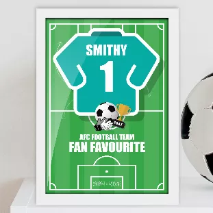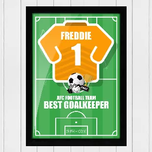 - Fully Personalised – Add the goalkeeper’s name, shirt number, kit colours, team name, and award title (e.g. Best Goalkeeper, Save of the Season, Manager’s Player, etc.).