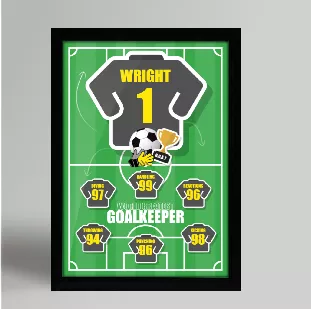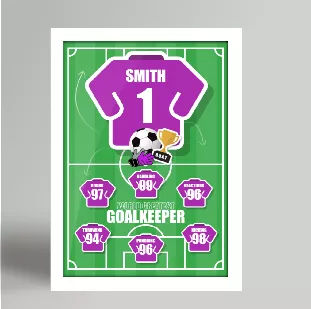 Celebrate the love for football with this custom A4 Personalised Goalkeeper Print! professional photo print. This dynamic artwork showcases a football pitch design featuring a goalkeeper jersey with your chosen name and number, complemented by skill ratings in categories like reflexes, handling, diving, and more. Perfect for football enthusiasts of all ages, it celebrates the unique attributes of the “World’s Greatest Goalkeeper.” The vibrant green pitch background is brought to life with energetic visuals like gloves, trophies, and footballs. You can even customise the goalkeeper glove colour for an extra personal touch. Whether displayed with or without a frame, this print is a fantastic gift for birthdays, sports fans, or anyone who takes pride in their goalkeeping journey. Perfect for goalkeeping stars, this print is a must-have for those who protect the net with pride!Key Features: